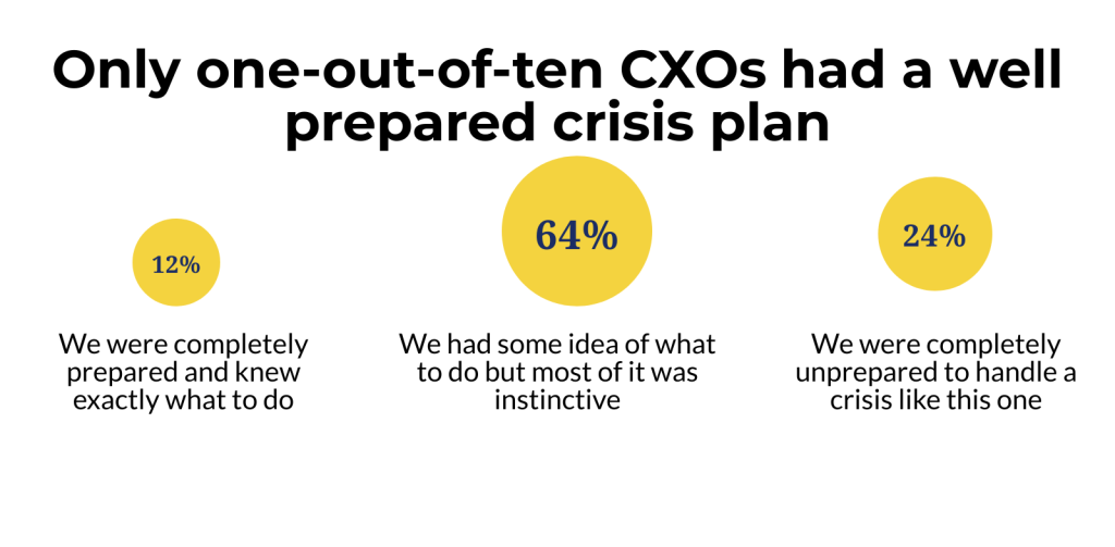 CXOs felt the immediate challenge in this crisis was managing cash flows (47%) and business continuity (28%). The key lesson they learnt was that engaged employees (40%) and crisis preparedness (31%) are critical for success in difficult times. Another interesting finding was that a strong reputation of the organization helps weather the storm as employees, partners, other stakeholders in the ecosystem are more invested.